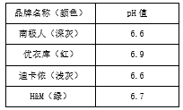 從實(shí)驗(yàn)數(shù)據(jù)中可以看出,四個(gè)品牌防曬服的pH值均符合“pH值在4.0—8.5范圍內(nèi)”的規(guī)定。也就是說,即使是在夏日貼身穿著這些品牌的防曬衣,我們的嬌弱的皮膚也不會(huì)受到刺激。