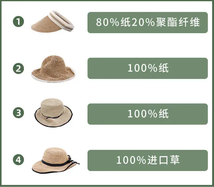 我們的紡織實驗員小哥哥在全公司征集了 4 頂草帽,包含了經(jīng)典草帽和近很流行的無頂草帽。為大家測試它們的防曬性能。
