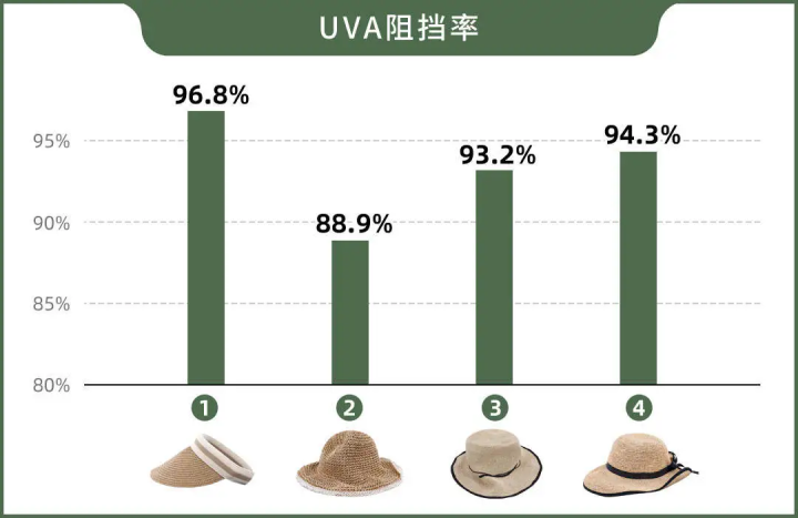 可以看出,1 ~ 4 號草帽基本都能阻止 88% 以上的紫外線。即使是紫外線阻擋率高的,也只阻擋了 96.8%。