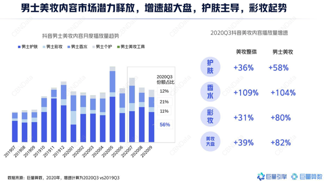 據(jù)巨量算數(shù)近日發(fā)布的《2020中國男士美妝市場(chǎng)洞察》顯示,2020年第三季度,男性用戶在抖音觀看護(hù)膚相關(guān)內(nèi)容的播放量增速,顯著超過女性用戶,其中男性58%、女性28%。同時(shí),男士美妝內(nèi)容市場(chǎng)增速超大盤,護(hù)膚主導(dǎo),彩妝起勢(shì)。