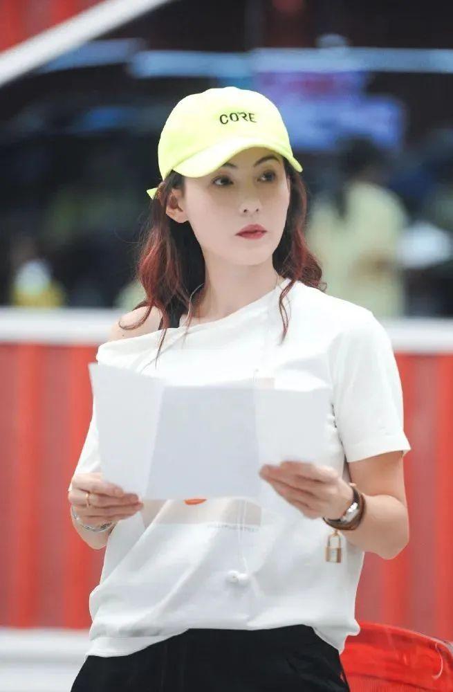 如果家里有顏色太過(guò)鮮艷不知道如何搭配的棒球帽,和張柏芝一樣搭配白T便不會(huì)出錯(cuò)。