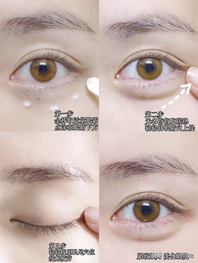 在使用眼霜時(shí),同樣重要的還有手法,首先把眼霜點(diǎn)涂在眼睛下方,然后用手指輕輕將眼霜涂抹開并向眼角方向提拉,后輕輕按壓眼尾的穴位,好的護(hù)膚品加上好的手法才能達(dá)到事半功倍的果。其實(shí)眼霜不僅可以涂抹眼部皮膚,像是法令紋、嘴角紋,都可以用眼霜來(lái)涂抹,達(dá)到改良皺紋的目的。