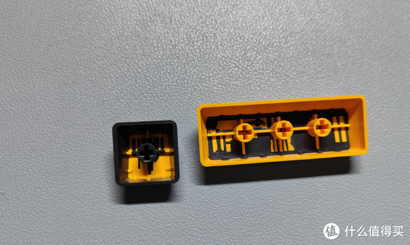 二色成型:把兩個(gè)顏色的塑料結(jié)合在一起,有UP主說(shuō)二色工藝需要兩套工藝,我不太確定,它的 特點(diǎn)就是字體顏色部分永不褪色,因?yàn)閴焊蛡€(gè)鍵帽主體不是一塊料,你把上面摩沒(méi)了,下面依然還是這個(gè)顏色。