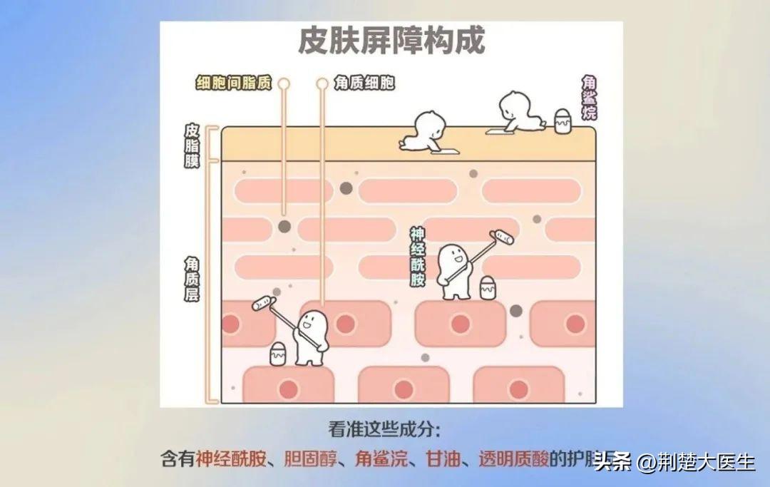 直接用帶有「修護(hù)功能」的護(hù)膚品,相當(dāng)于先給皮膚鋪好地基,讓皮膚屏障更堅(jiān)韌。皮膚屏障的表皮層像「磚墻結(jié)構(gòu)」,在角質(zhì)細(xì)胞(磚塊)周圍充斥著細(xì)胞間脂質(zhì)(水泥漿),形成皮膚「護(hù)城墻」。所以選購(gòu)護(hù)膚品時(shí),別光顧著補(bǔ)水保濕,可以針對(duì)性補(bǔ)充些「水泥漿」——脂質(zhì)成分。