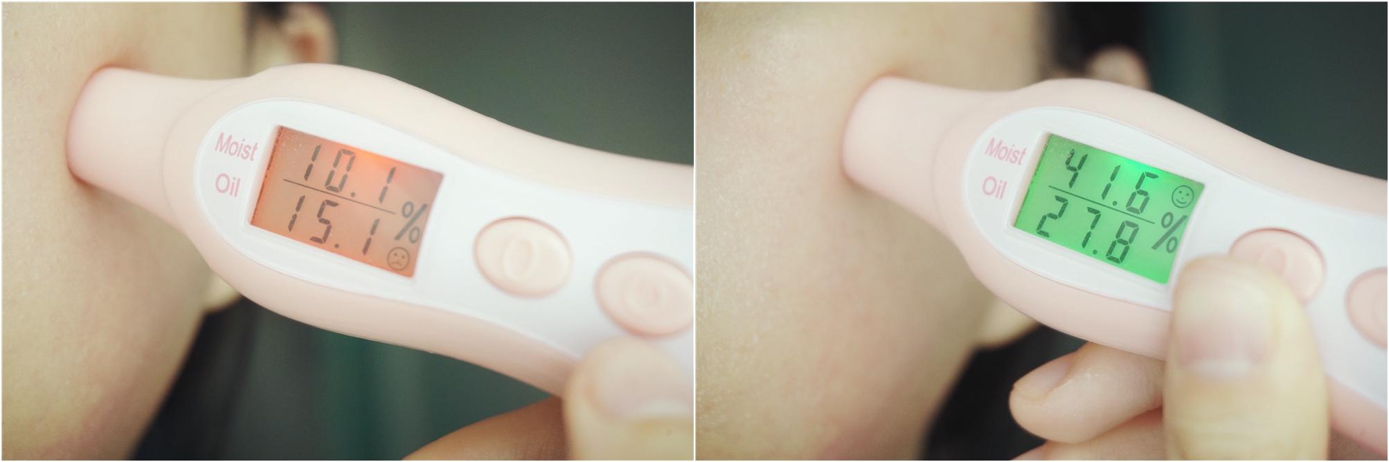 測(cè)試方法:對(duì)敷面膜前后的肌膚進(jìn)行水油測(cè)試,然后把前后測(cè)試的數(shù)值進(jìn)行對(duì)比。