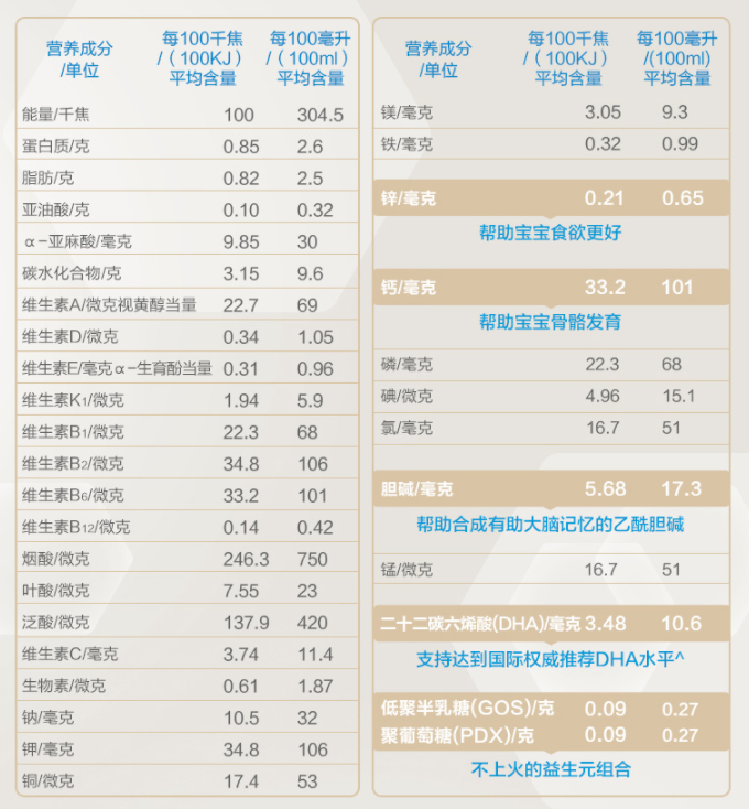 從配方的角度來看,液態(tài)奶的表現(xiàn)算不上,市面上很多國行版、國產(chǎn)奶粉添加的特色強化配方、DHA等要更加豐富。