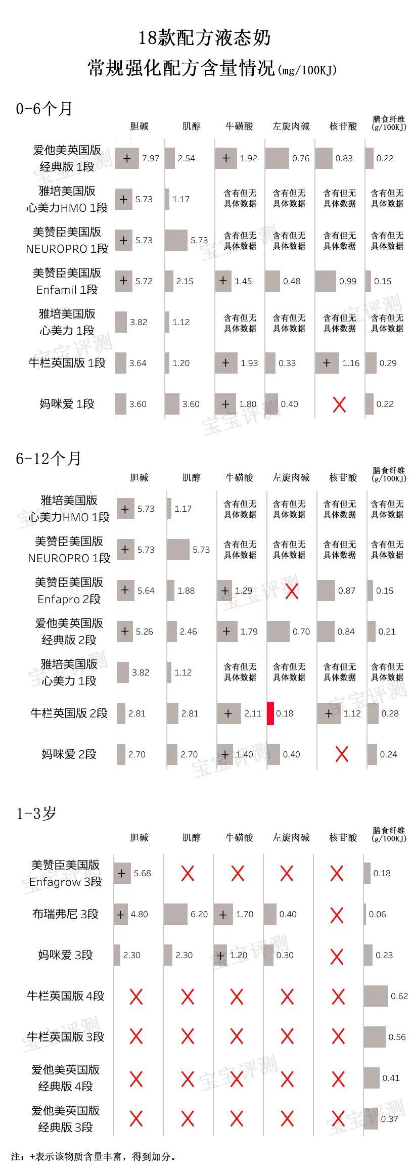 3、10款液態(tài)奶的膽堿含量較多、10款的?;撬?/strong>含量較多、2款的核苷酸含量較多,得到額外加分(標(biāo)注為+)。