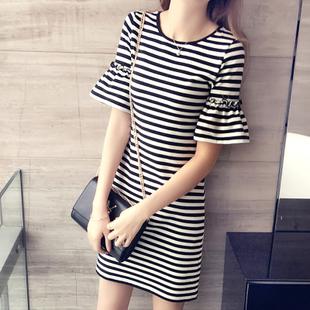 春夏裝新款韓版修身顯瘦荷葉袖短袖女式T恤中長(zhǎng)款女士條紋連衣裙