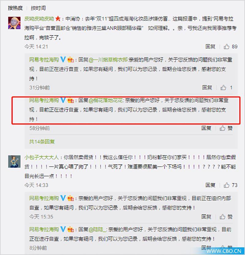 有趣的是,此次檢測,網(wǎng)易考拉海購平臺“自營直郵倉”銷售的雅詩蘭黛ANR眼部精華霜被認(rèn)為是“假貨”?!痘瘖y品財(cái)經(jīng)在線》記者在@網(wǎng)易考拉海購官網(wǎng)微博中看到,平臺這番“賊喊捉賊”的套路讓許多消費(fèi)者感到憤怒。