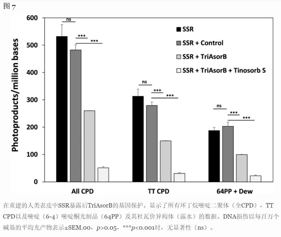 發(fā)表在《光化學(xué)與光生物學(xué)》的一篇論文中表示,TriAsorB 可防止SSR照射誘導(dǎo)的 DNA 損傷,并專門保護(hù)皮膚免受高能可見光誘導(dǎo)的氧化損傷,5%TriAsorB能夠抑制51.08%的DNA損傷,其在防曬產(chǎn)品中以大限度地保護(hù)基因,并限制過度的光照傷害[1]。