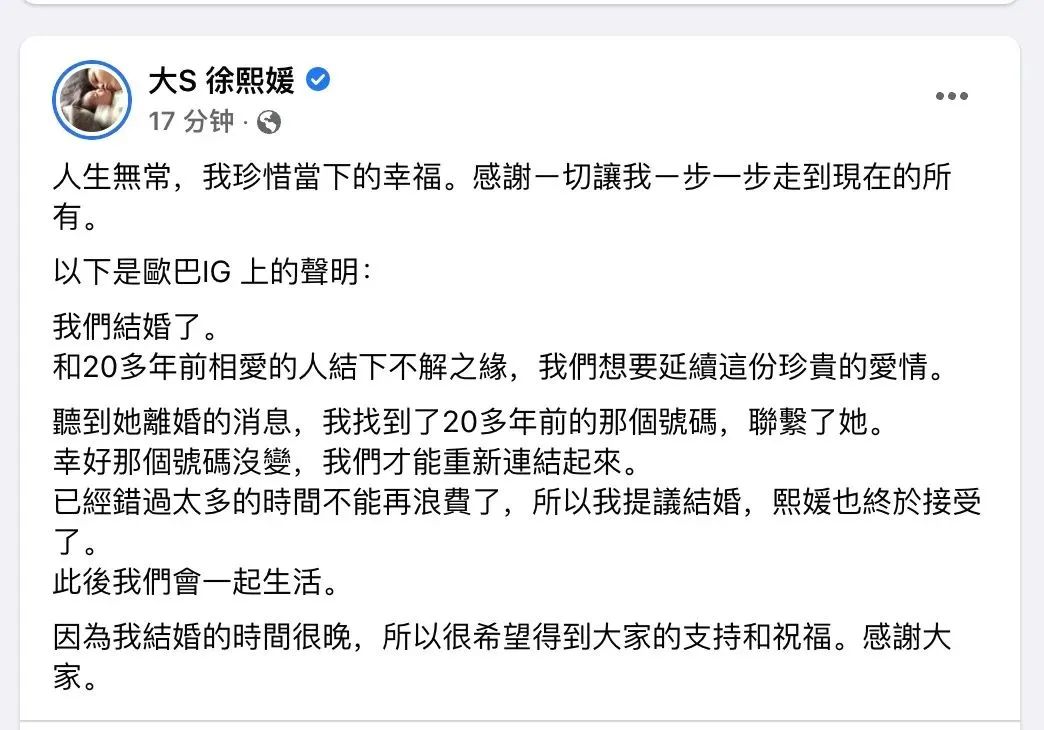 大S也緊隨其后,發(fā)文稱:“人生無(wú)常,我珍惜當(dāng)下的幸福,感謝一切讓我一步一步走到現(xiàn)在的所有。”