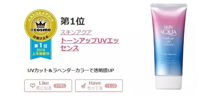 第一名是樂敦的SKIN AQUA,淡紫色的防曬霜可以稍微修飾膚色,獨特的細微光感微粒科技可以360度反射光線,簡直自帶環(huán)形燈,使皮膚看起來更明亮通透。富含玻尿酸等保濕成分和維他命C衍生物,防曬的同時也要美白保濕。INS上曬圖一大堆,簡直人手一支。
