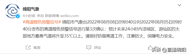 與此同時,綿陽氣象臺連續(xù)三天發(fā)布高溫預警:預計從今天白天開始,未來一周我市涪城、游仙、安州、江油、北川的大部地方將持續(xù)出現(xiàn)日高氣溫為35℃以上的高溫天氣。三臺、鹽亭、梓潼的部分地方可達37℃以上。