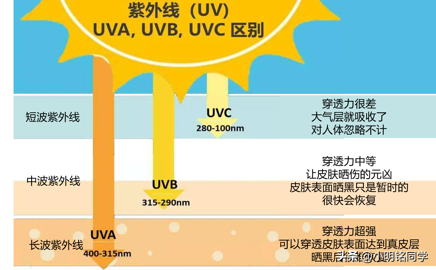 我先來跟大家說說為什么要防曬吧,防的究竟是什么?難道就單純的是防太陽(yáng)光嗎?太陽(yáng)光不是紫外線,但是太陽(yáng)光中包含了紫外線。順帶科普一下,免得大家看得云里霧里,不知所以,很多說防曬衣的人都會(huì)聊到這兒,防曬主要就是防的紫外線!這基本上是眾所周知的了。但是接下來他們沒跟你們說,太陽(yáng)照射的紫外線分為