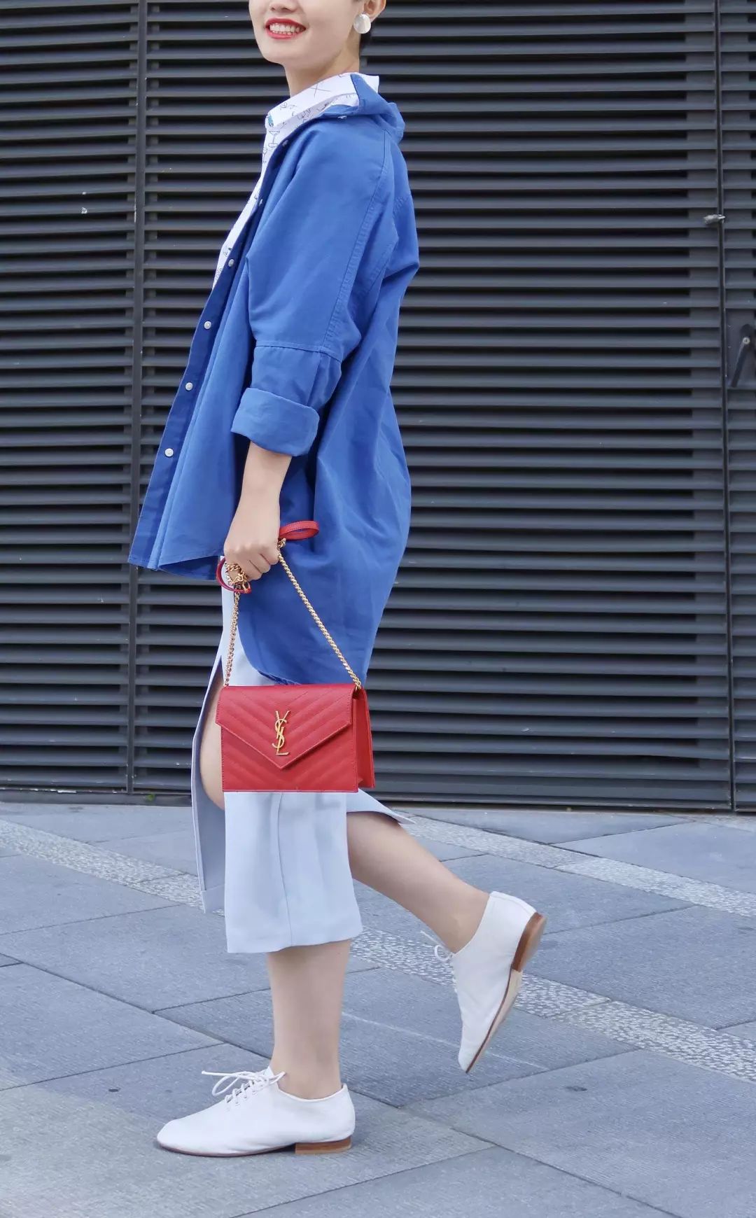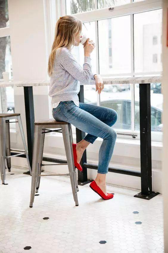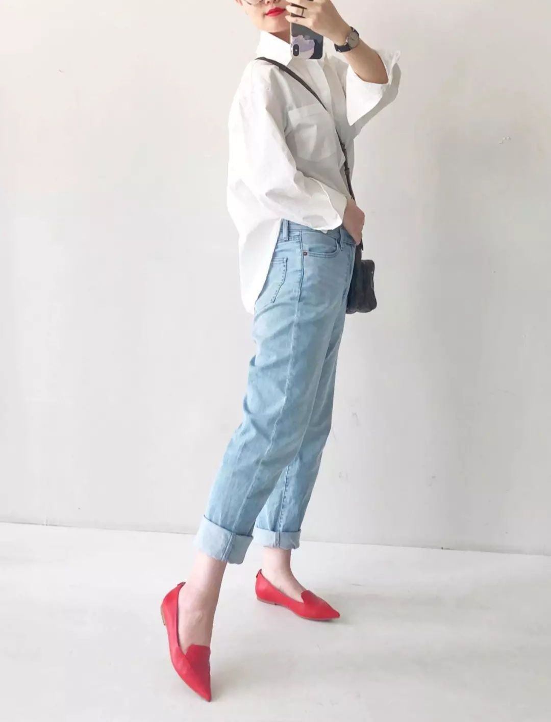 白襯衫+牛仔褲,搭上紅色尖頭樂福鞋,一下子就不無聊了。你們可以想想如果同樣的打扮穿一雙很普通的運動鞋會是什么感覺,就是沒有什么問題,但是也很普通沒亮點。