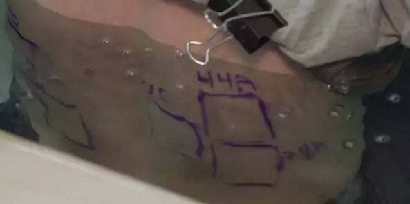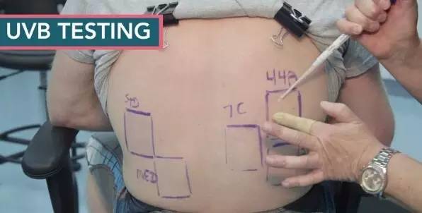 為了考察抗UVB防護(hù)果,測(cè)試員將一定量的防曬霜涂抹到后背六處地方,然后浸泡在浴缸中。這之后,用6個(gè)太陽(yáng)光模擬器發(fā)出的UVB光照射在被涂抹的六處地方,大約1天后,評(píng)估被照射處的紅腫情況。