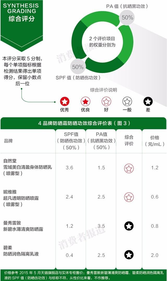 而本刊2015年5月測(cè)試的4款防曬霜中,自然堂雪域美白輕盈身體防曬乳與妮維雅超凡透明防曬噴霧的綜合表現(xiàn)較好,其中妮維雅的表現(xiàn)更為均衡。