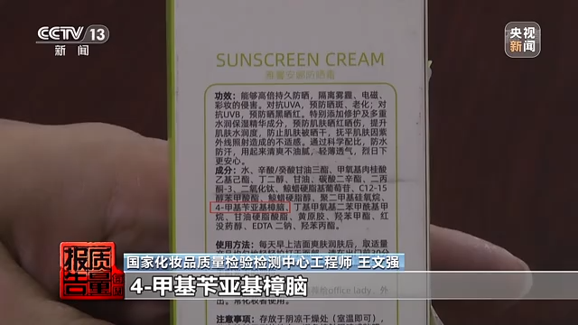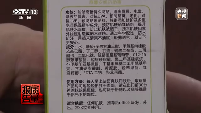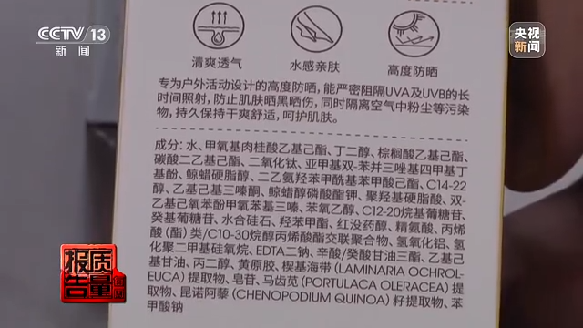 據(jù)檢測工程師介紹,產(chǎn)品標(biāo)簽和注冊信息中標(biāo)注了的成分,實際卻未檢出,這樣的產(chǎn)品可能達不到應(yīng)有的防曬果。而在采訪中記者注意到,這款標(biāo)稱“雅馨安娜防曬霜”的問題不止于此,檢測工程師在其中檢出了一種兒童、孕婦等敏感人群需謹(jǐn)慎使用的防曬劑成分——二苯酮-3,而這個成分在其產(chǎn)品標(biāo)簽中并未標(biāo)注。