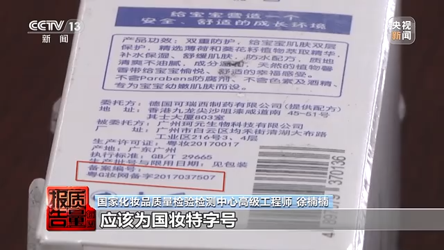 化妝品質(zhì)量檢驗檢測中心高級工程師 徐楠楠:此次網(wǎng)購產(chǎn)品“可瑞西寶貝水潤防護乳”,網(wǎng)頁宣稱具有物理防曬功,為兒童防曬化妝品,屬于特殊用途化妝品。但是實際產(chǎn)品為防護乳,屬于普通化妝品,而非特殊用途化妝品。產(chǎn)品的標(biāo)簽上面顯示的備案號為非特殊用途化妝品的備案號,特殊用途化妝品的編號應(yīng)該為“國妝特”字號,標(biāo)簽上的成分雖然標(biāo)注了物理防曬劑成分為二氧化鈦和氧化鋅,但是根據(jù)產(chǎn)品檢驗檢測結(jié)果顯示,物理防曬劑雖然有微量檢出,但含量遠未達到起防曬果的含量要求。說明經(jīng)營者利用網(wǎng)頁對商品做出了與實際內(nèi)容不符的虛假宣傳。