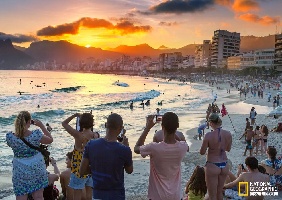 游客在里約熱內(nèi)盧的伊帕內(nèi)瑪海灘拍攝落日。