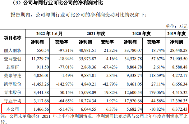 銷售費用中的推廣費用快速增長,但公司的毛利率卻無增長。因此,雖然拉拉米的收入仍保持了小幅增長,但2022年上半年公司的凈利潤還是與可比公司一樣出現(xiàn)了下滑。年化后,2022年上半年,拉拉米的凈利潤較2021年相比,出現(xiàn)了51.47%的下滑。