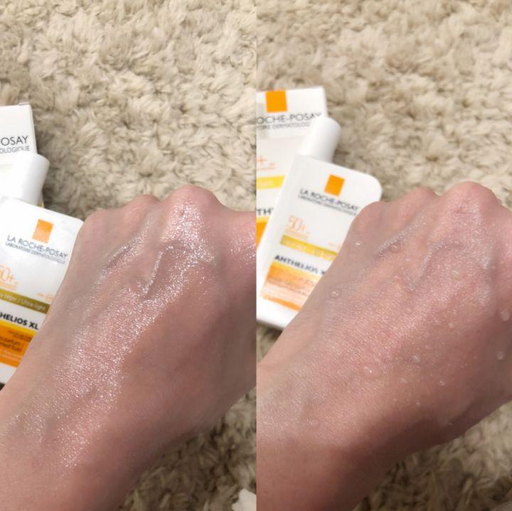 SPF 50+ PA++++, 無香味,質地水潤,剛涂上有點泛白但一下就吸收,成膜快,不粘膩,防水能力強,適合流汗多或油性肌膚的人使用,無論日?;蚴峭嫠即笸?。