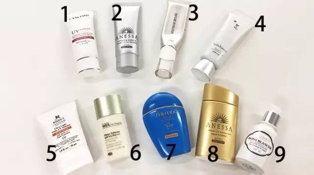 從1至9分別是:蘭蔻柔皙輕透防曬露、安耐曬臉部專用防曬啫喱、怡麗絲爾優(yōu)悅活顏防護(hù)精華乳、雪花秀滋晶雪膚美白防護(hù)乳霜、科顏氏清爽防曬隔離乳液、悅木之源韋博士卓越防護(hù)隔離乳、資生堂新艷陽(yáng)夏臻水動(dòng)力防護(hù)乳、安耐曬金瓶防曬霜、歐舒丹煥亮防曬乳