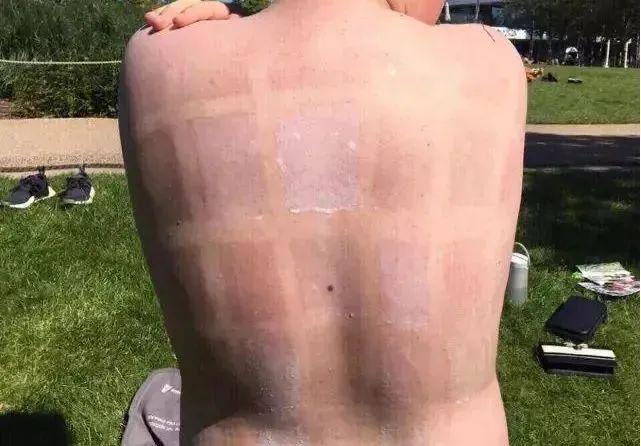 一外國男子曾做過關(guān)于防曬的實驗,如下圖。他把他的背分為15個區(qū)域涂上不同的防曬霜,結(jié)果發(fā)現(xiàn)貼膠帶的地方白,這說明了什么?衣服才是阻擋紫外線有的手段。
