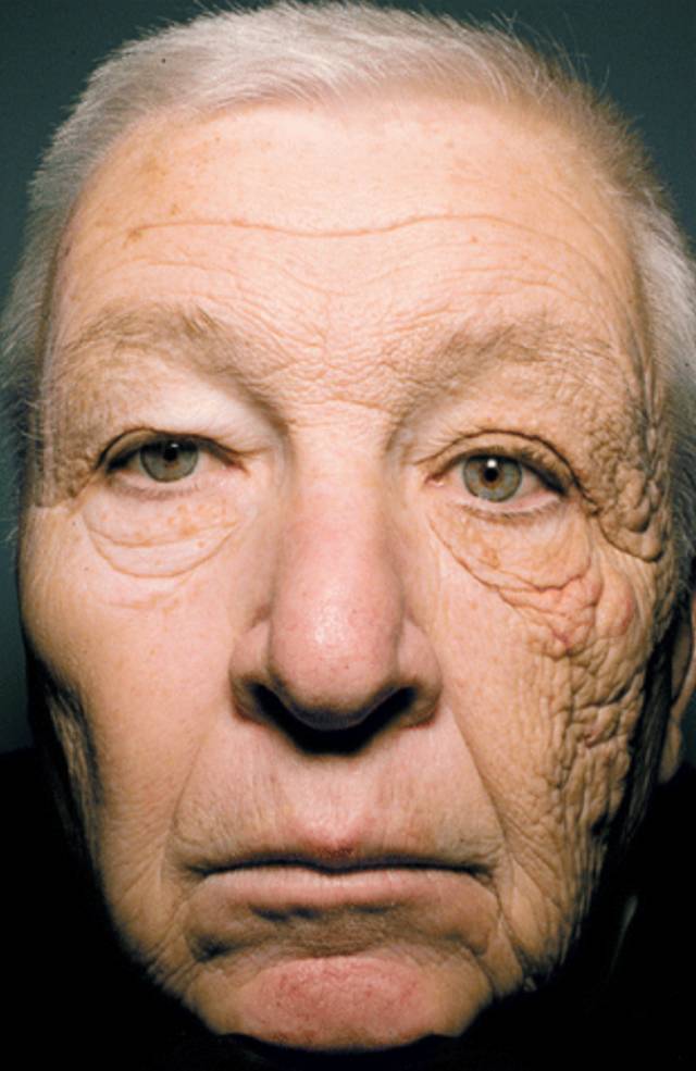 一位男性30年來長期在同一個(gè)靠窗的工作崗位上,紫外線長期透過窗戶照射到臉上,面向窗戶的半邊臉光老化尤其嚴(yán)重。