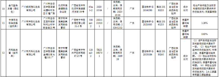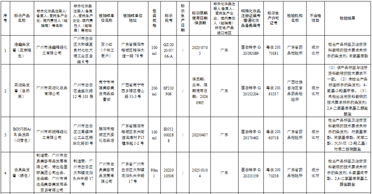 根據(jù)《通告》,在2022年化妝品監(jiān)督抽檢工作中,經(jīng)廣西壯族自治區(qū)食品藥品檢驗(yàn)所等單位檢驗(yàn),標(biāo)示為廣州市浩鑫精細(xì)化工有限公司生產(chǎn)的浩鑫染發(fā)膏(亞麻褐色)等20批次化妝品不符合規(guī)定。