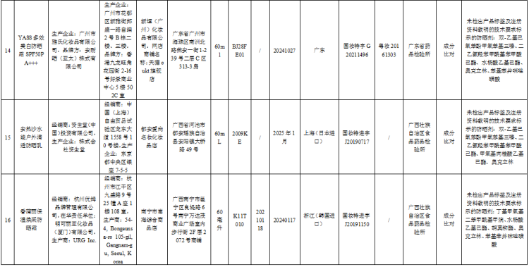 標(biāo)示為資生堂(中國(guó))投資有限公司經(jīng)銷,株式會(huì)社資生堂生產(chǎn)的安熱沙水能戶外清透防曬乳(標(biāo)示批號(hào):2009KE)被檢出成分比對(duì)不合格,檢驗(yàn)結(jié)果為未檢出產(chǎn)品標(biāo)簽及注冊(cè)資料載明的技術(shù)要求標(biāo)示的防曬劑:雙-乙基己氧苯酚甲氧苯基三嗪、二乙氨羥苯甲?;郊姿峒乎ァ⒓籽趸夤鹚嵋一乎?、奧克立林。和安熱沙情況相似的,還有YASS多美白防曬霜SPF50PA+++(粵妝20161303)、香蒲麗保濕煥采防曬霜、采潔防曬霜(粵妝20161537)等。