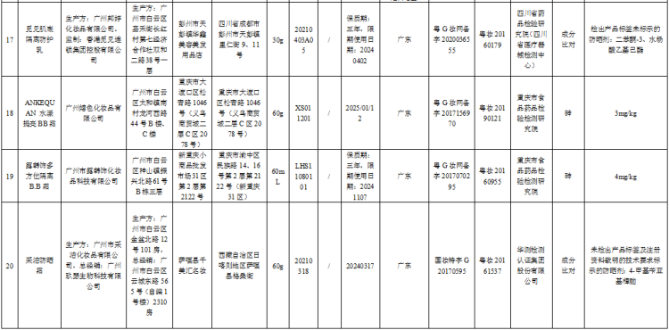防曬乳里未檢測(cè)到標(biāo)識(shí)的防曬劑,BB霜里卻出現(xiàn)了未標(biāo)識(shí)的防曬劑,這些情況都屬違規(guī)。近日,藥監(jiān)局發(fā)布《關(guān)于20批次不符合規(guī)定化妝品的通告》(以下簡(jiǎn)稱《通告》)顯示,浩鑫染發(fā)膏(亞麻褐色)、卡姿蘭美顏大咖奢護(hù)BB霜(02典雅自然色)、安熱沙水能戶外清透防曬乳、ANKEQUAN 水漾提亮BB霜、露韓飾多方位隔離B.B霜等20批次化妝品不符合規(guī)定。