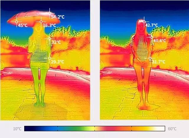 圖為站在小黑傘下與暴曬在陽光下的溫度對比