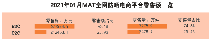 數(shù)據(jù)顯示,本次全網(wǎng)防曬數(shù)據(jù)中,B2C電商平臺占主要市場份額,B2C零售額占比遠超過C2C。綜合類電商仍是網(wǎng)民們的主要購買陣地,零售額占比92.4%。