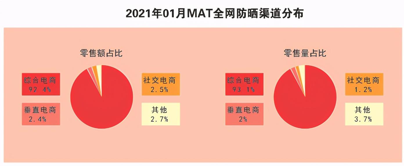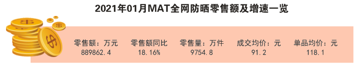 春暖花開時節(jié),防曬品銷售也逐漸升溫。本期數(shù)據(jù),我們來回顧下防曬品線上近一年的表現(xiàn)。歐特歐國際咨詢公司調(diào)研的大數(shù)據(jù)顯示,2021年01月MAT(2020年2月-2021年1月)全網(wǎng)防曬零售額超過88.98億元,同比增長18.16%??缇愁惍a(chǎn)品零售額達38.62億元,占總銷售額的43.4%。