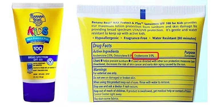 香蕉船好幾款兒童防曬產(chǎn)品中,明確標明含有 3.5% 的oxybenzone。