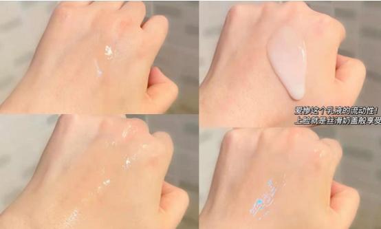 乳液質(zhì)如奶蓋一般的流動液體,是很絲滑的水質(zhì)地,涂起來延展性不錯。