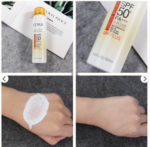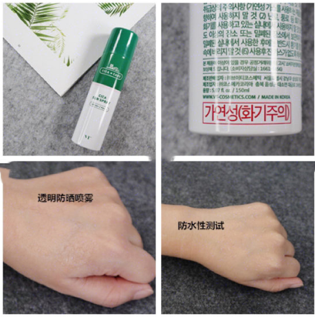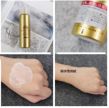噴出來(lái)是白色噴霧,噴霧也沒碧柔那么細(xì)密,不過推開之后還好,不會(huì)泛白。防曬性也還可以。