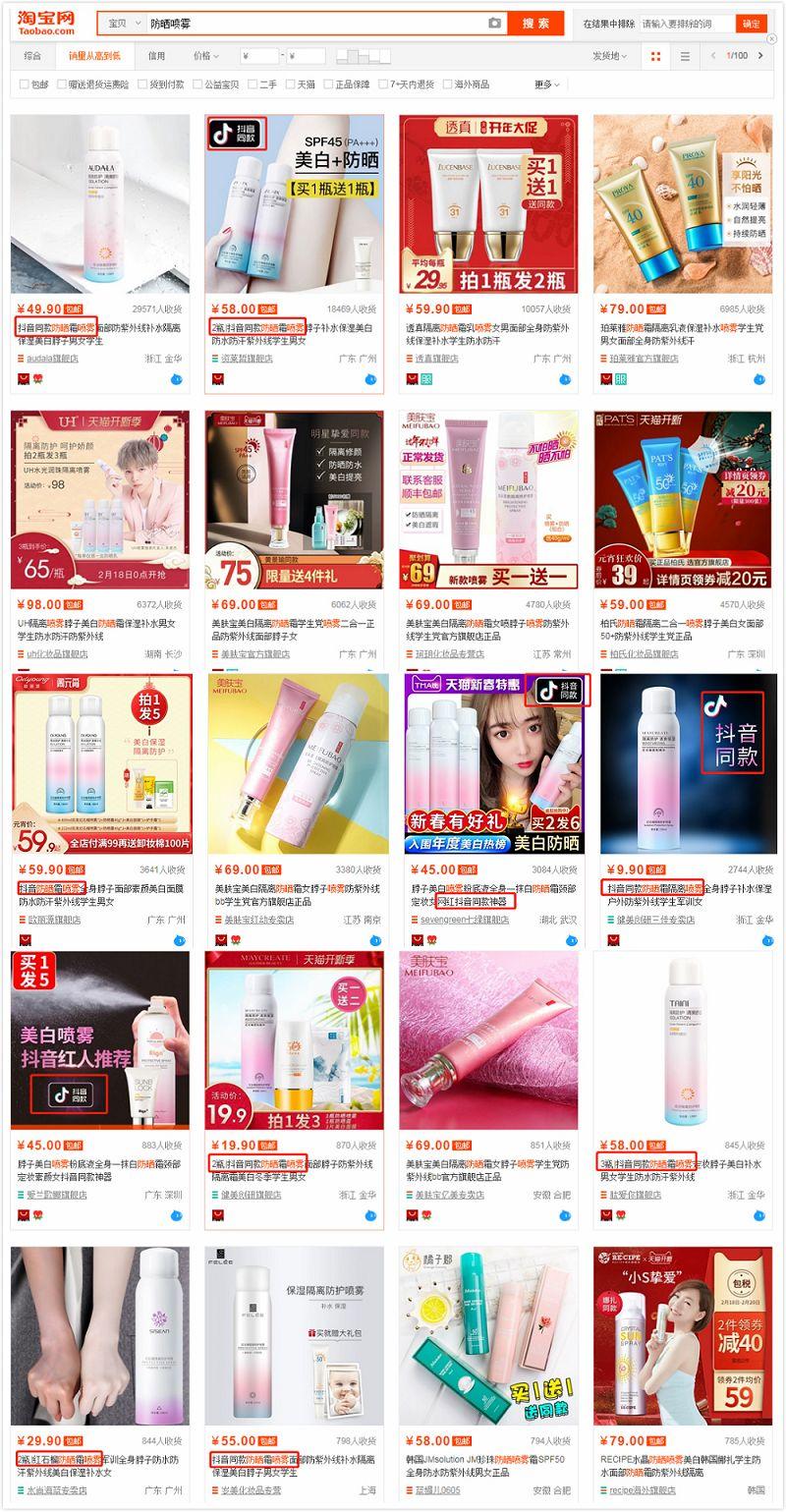 羊羊羊在淘寶網(wǎng)以防曬噴霧作為關(guān)鍵詞搜索,并按照銷(xiāo)量從高到低排序,發(fā)現(xiàn)銷(xiāo)量前30中近一半都是以“抖音同款”為賣(mài)點(diǎn)的產(chǎn)品,占據(jù)了該品類(lèi)排名的半壁江山。而曾經(jīng)的“娜扎同款”——“娜麗絲防曬噴霧”和“玥之秘水晶防曬噴霧”等反而落后。