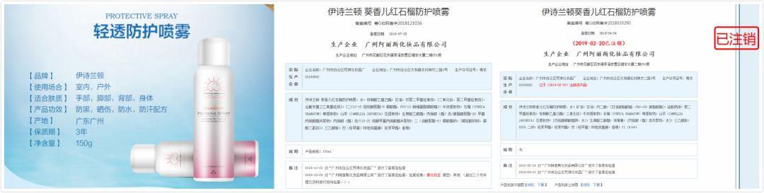 其中,羊羊羊在藥監(jiān)局非特殊用途化妝品(以下簡(jiǎn)稱(chēng)非特化妝品)備案系統(tǒng)中一一對(duì)應(yīng)查詢得知,“伊詩(shī)蘭頓防護(hù)清透噴霧”實(shí)際備案產(chǎn)品名稱(chēng)為“伊詩(shī)蘭頓 葵香兒紅石榴防護(hù)噴霧”,“ Algn/愛(ài)蘭歌娜美白防曬霜噴霧”實(shí)際備案產(chǎn)品名為“愛(ài)蘭歌娜紅石榴隔離防護(hù)噴霧”,其銷(xiāo)售平臺(tái)中產(chǎn)品名稱(chēng)與實(shí)際備案名稱(chēng)不符,屬于違規(guī)行為。另外,羊羊羊于2月20日15點(diǎn)45分左右再次查詢藥監(jiān)局非特化妝品備案信息時(shí)卻發(fā)現(xiàn),“伊詩(shī)蘭頓 葵香兒紅石榴防護(hù)噴霧”已被注銷(xiāo),但截至發(fā)稿該產(chǎn)品在伊詩(shī)蘭頓旗艦店仍處于正常銷(xiāo)售狀態(tài)。