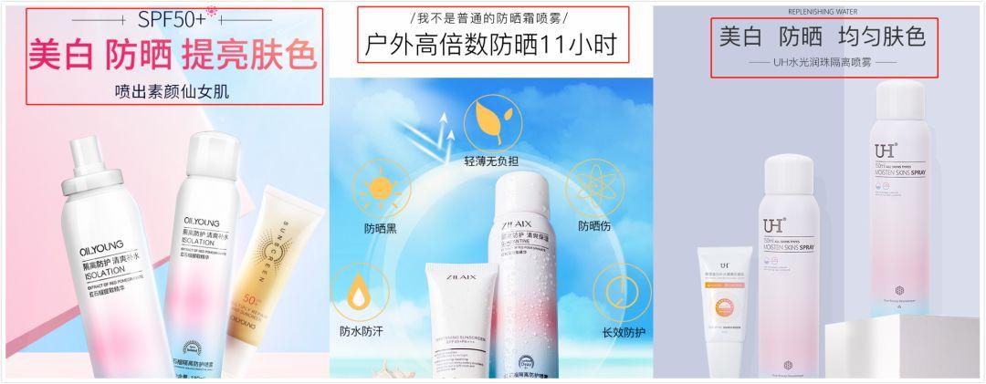 除此之外,其他噴霧產(chǎn)品均僅能查詢到對(duì)應(yīng)的非特殊用途化妝品備案信息。但令人吃驚的是,上述產(chǎn)品卻借著與防曬霜/乳的組合,含糊其辭,介紹功時(shí)故意將噴霧與防曬“捆綁”在一起,強(qiáng)調(diào)“美白、防曬”的功宣稱(chēng),但其實(shí)不管是宣傳還是銷(xiāo)售層面,還是以噴霧為主。