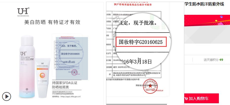但“抖音同款”噴霧們的問(wèn)題可不僅僅止步于宣傳上。在調(diào)查過(guò)程中,羊羊羊發(fā)現(xiàn)在排名內(nèi)的所有“抖音同款”噴霧都在產(chǎn)品信息或者詳情中聲稱(chēng)自己是防曬類(lèi)的特殊用途化妝品,且明示了該產(chǎn)品的特證批準(zhǔn)文號(hào)。