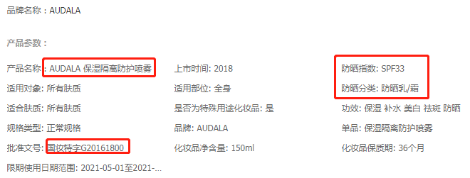 根據(jù)產(chǎn)品詳情,UH水光潤(rùn)珠隔離噴霧搖身一變成了“UH顏蔻美白補(bǔ)水隔離防曬乳”。非特化妝品備案的AUDALA保濕隔離防護(hù)噴霧還明確標(biāo)注了SPF33的防曬指數(shù)。
