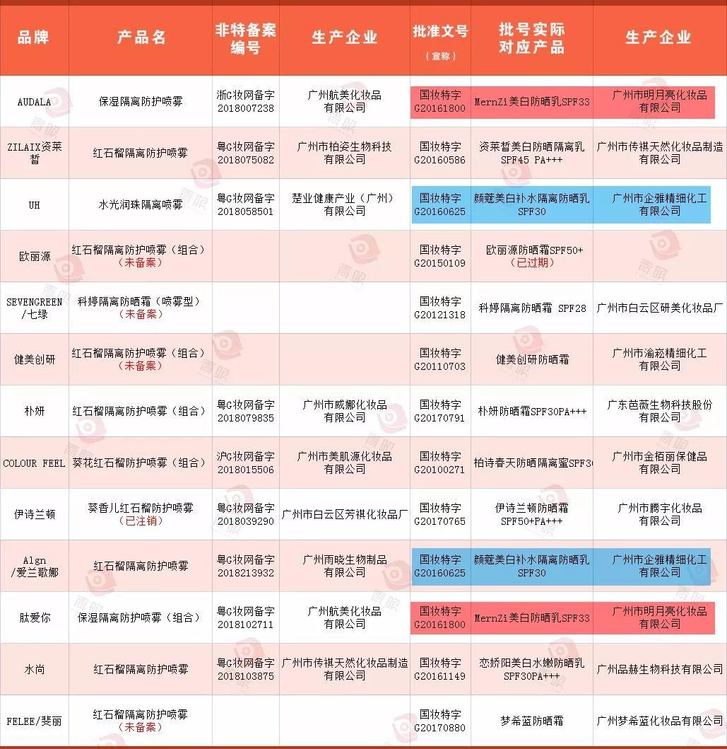 ▍13款“抖音同款”噴霧的備案及生產(chǎn)信息(不同顏色特別標(biāo)記的為兩組重復(fù)的批號(hào))