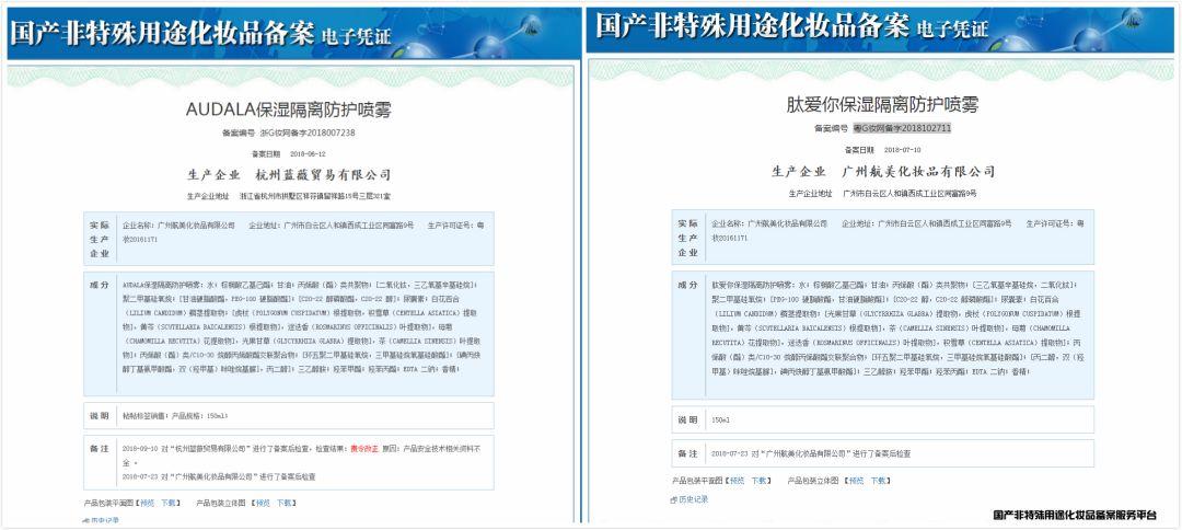 值得一提的是,上文中兩組重復(fù)批號(hào)的4個(gè)產(chǎn)品,相對(duì)應(yīng)的AUDALA和肽愛(ài)你的噴霧產(chǎn)品生產(chǎn)企業(yè)和“套用”的特證防曬品生產(chǎn)企業(yè)均一致,不僅外包裝一樣,成分也僅僅是變換個(gè)別成分的添加順序。