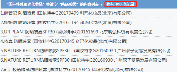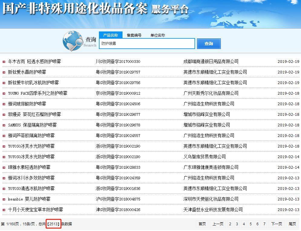 不過(guò)羊羊羊也發(fā)現(xiàn),防曬噴霧近兩年來(lái)如此火爆,但在藥監(jiān)局備案系統(tǒng)中,國(guó)產(chǎn)防曬噴霧的特殊用途備案總共才160條記錄,從2017年至今僅新增了22條,其中2018年僅新增8條,2019年還沒(méi)有新增記錄。但令人玩味的是,在非特用途化妝品備案系統(tǒng)中,“防護(hù)噴霧”相關(guān)產(chǎn)品備案共計(jì)2513條數(shù)據(jù)(截至2019年2月20日16點(diǎn)20分),是防曬噴霧的15倍。其中2019年新增數(shù)據(jù)135條,2018年新增1700余條,是防曬噴霧的229倍。換句話說(shuō),其中73%的防護(hù)噴霧都是在2017年防曬噴霧走紅之后出現(xiàn)的。