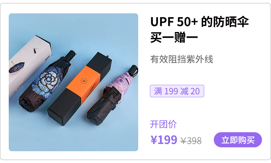 還能參加滿 199 減 20 活動(dòng),相當(dāng)于 2 把防曬傘到手只要 179 元?。?/strong>