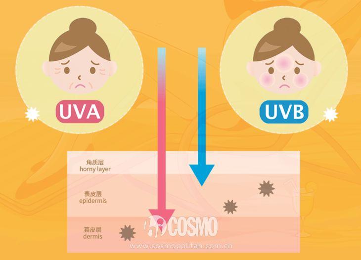 紫外線根據(jù)波長可以劃分為UVA、UVB和UVC三種,波長越長,穿透能力越強。其中UVA和UVB會對肌膚產(chǎn)生比較大的傷害。UVA會破壞主要成分——膠原蛋白的結構,使皮膚厚度減薄,失去豐盈和潤澤。當UVA進一步照射到基底層下的纖維母細胞時,就會抑制它合成膠原蛋白。也就是說,UVA會讓皮膚制造膠原蛋白的能力下降,造成皮膚衰老。