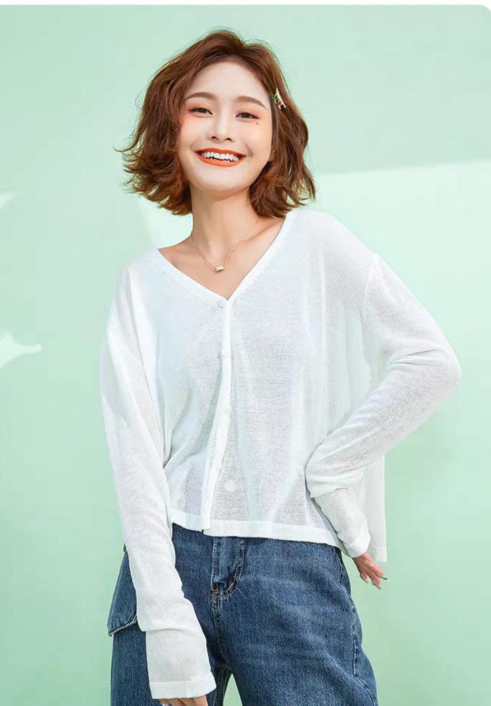 網(wǎng)紗類的防曬衫除了雪紡面料之外,近幾年流行的還有一種比較精致輕薄的紗質(zhì)防曬衫。這種防曬衫比雪紡面料的還要輕薄,幾乎是透明的,在衣服上會(huì)有各種各樣精致的小刺繡,都是一些花朵或者是水果之類的可愛(ài)的元素,穿在身上會(huì)將人襯托的元?dú)狻?/p>2、針織防曬衫溫柔優(yōu)雅
