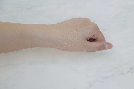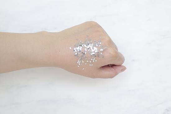 (將產(chǎn)品涂抹在手背上至吸收,再撒上相同數(shù)量的彩色亮片,用力甩手后,殘留越少證明產(chǎn)品越清爽。)